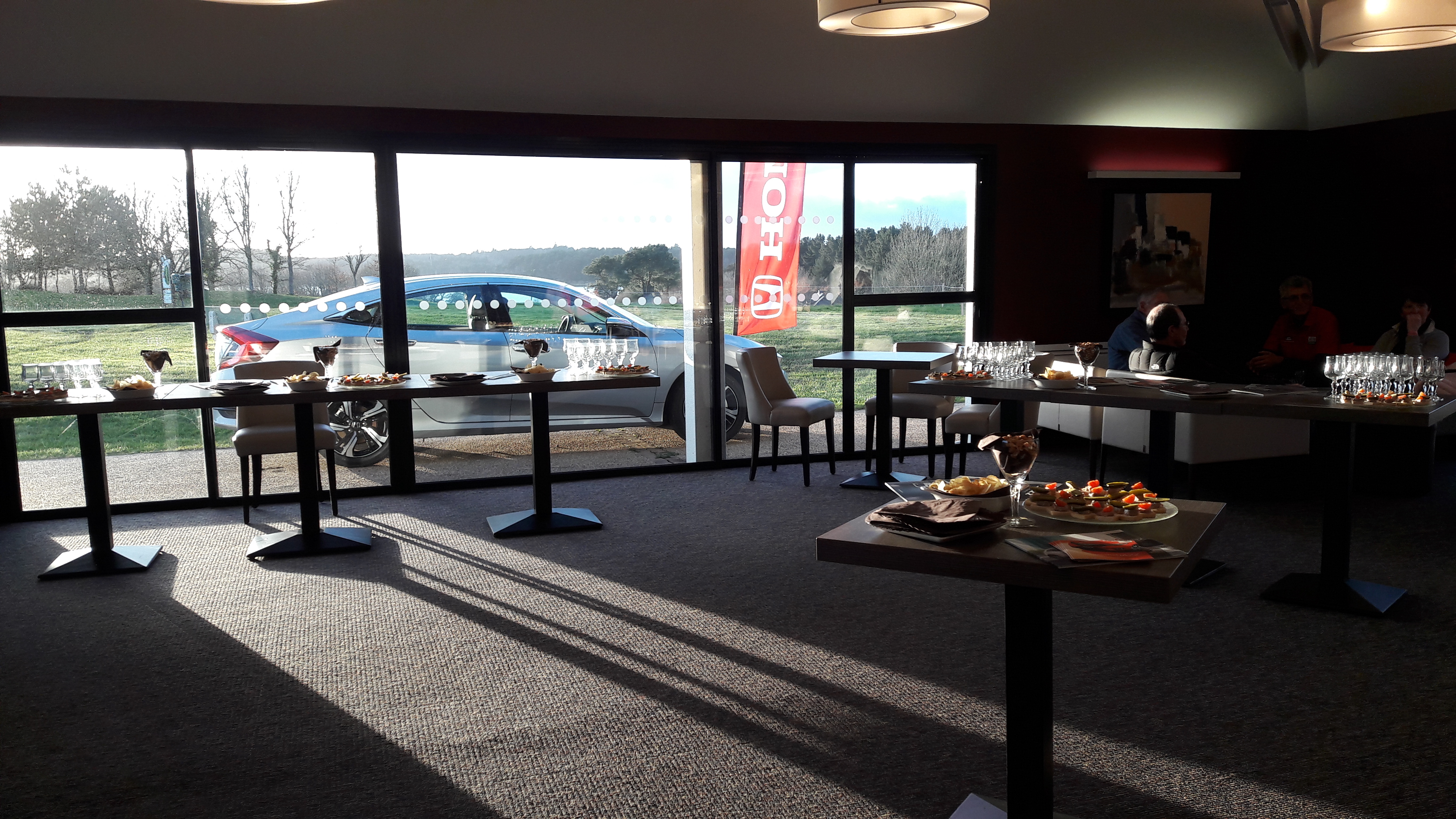Terrain totalement détrempé.. Normal beaucoup de pluie.. 9h10, pas de sandwich au restaurant avant le départ d’une compétition !.. 5h40 pour faire 18 trous.. Personne sur le parcours pour faire accélérer les 4 joueurs en promenade devant nous..!. Enfin le retour au restaurant à 15h02 pour déjeuner. Dommage le restaurant est fermé à 15h00.